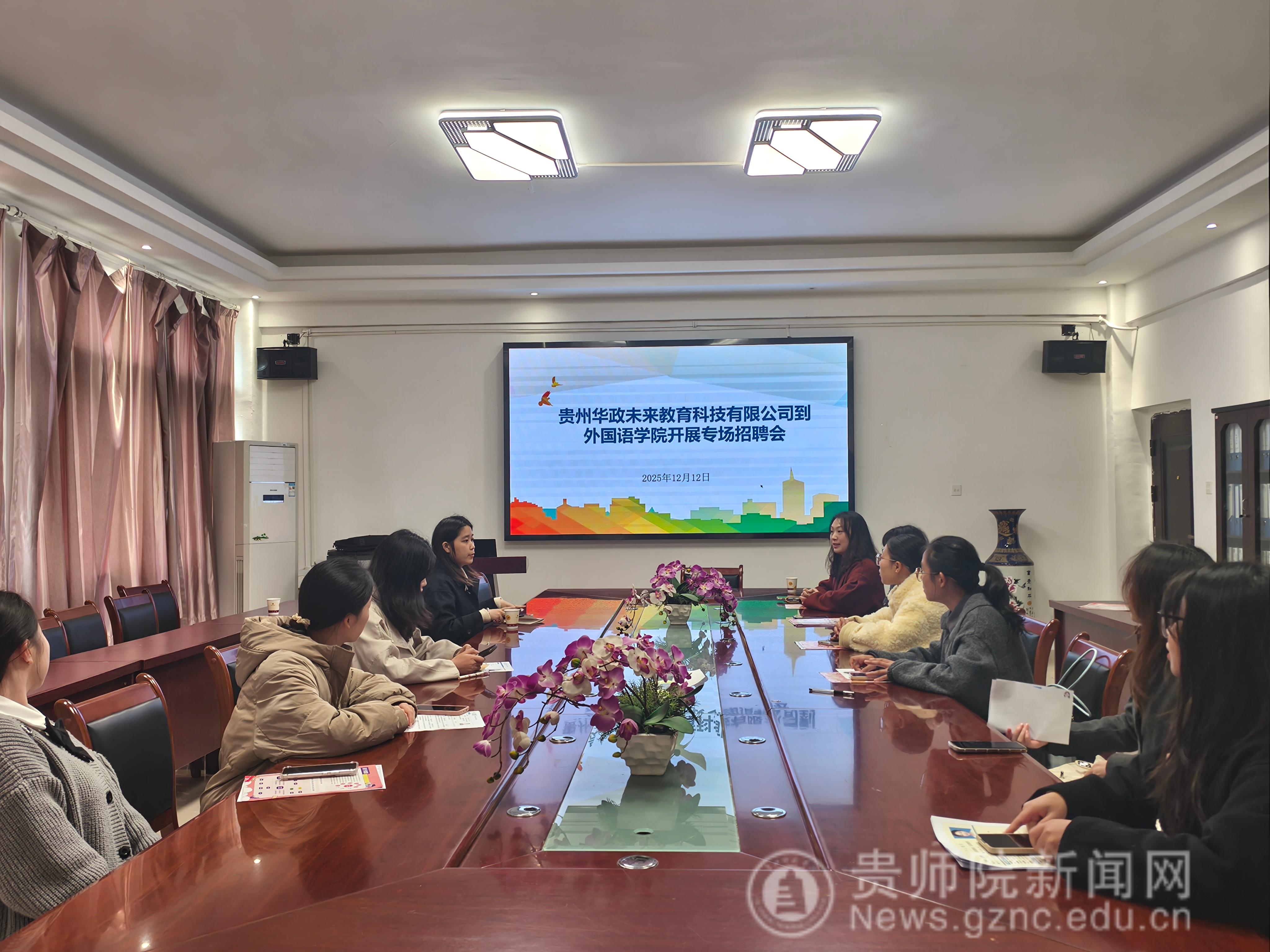 本网讯 12月12日,贵州华政未来教育科技有限公司代表一行走进外国语学院,开展“访企拓岗”专项交流活动并举办专场招聘宣讲会,精准对接人才需求,拓宽学子就业渠道。学院党委副书记张维域出席活动,与企业代表深入座谈交流。