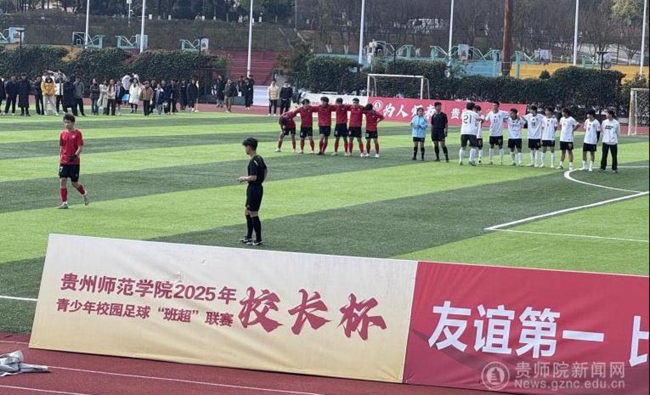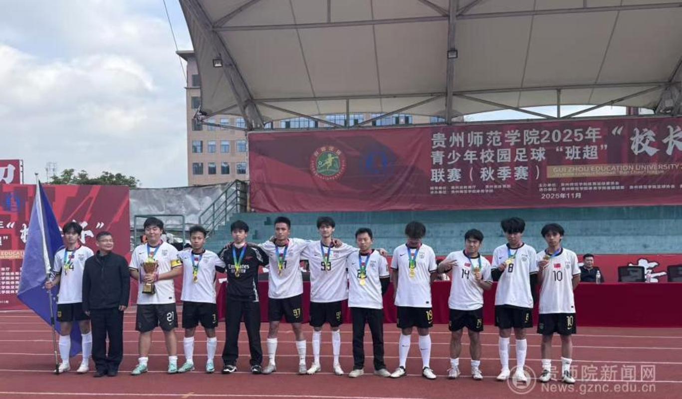 本网讯 近日,贵州师范学院2025年“校长杯”青少年足球“班超”联赛(秋季赛)圆满落幕。我院24级英语四班王言辙、25级英语四班张鹏鹏与商学院学子组成联队,赛场拼搏、默契配合,一路过关斩将,摘得本次联赛桂冠。其中,我院25级英语四班张鹏鹏凭借出色的赛场表现,斩获“最佳球员”称号。