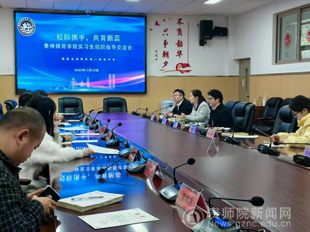 为深化校地协同育人,切实了解师范生实习成效,2025年11月18日,外国语学院英语系主任岑艳琳、专任教师程俊龙一行赴贵阳市南明区第一实验中学实习基地,开展2022级师范生教育实习中期巡视工作。贵阳市南明区第一实验中学校长李林等校领导予以热情接待。